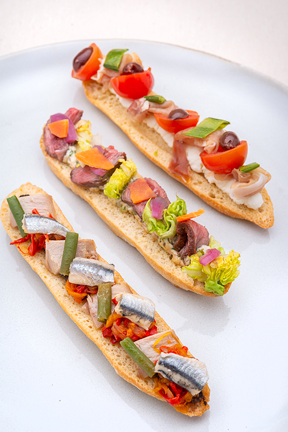 30 Ventrèche de thon Germon confit à l’huile d’olive, tapenade d’olive noire, anchois, poivrons confits, haricot vert
